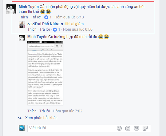 Face booker Cường Ngô bình luận: “Loài này đã được liệt vào sách đỏ, cần bảo tồn. Dân mình không có ý thức, cứ vô tư giết hại thế này thì chắc chắn thế hệ con cái không có cơ hội biết về loài mèo rừng. Mong các cơ quan chức năng truy tìm xử lý những đối tượng này để răn đe”.