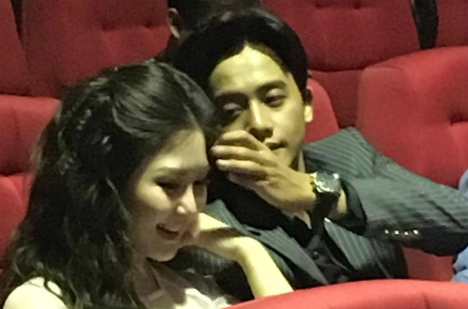 Ngồi trong rạp phim, Hương Tràm cười tít mắt còn Mai Tài Phến thỉnh thoảng quay sang ngắm cô.
