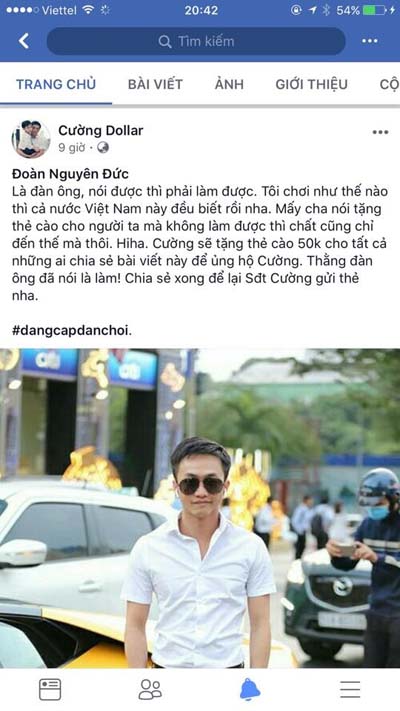 “Là đàn ông, nói được thì phải làm được. Tôi chơi như thế nào thì cả nước Việt Nam này biết rồi nha. Mấy cha nói tặng thẻ cho người ta mà không làm được thì chất cũng chỉ đến thế mà thôi. Cường sẽ tặng thẻ cào 50k cho người nào chia sẻ status này của Cường. Thằng đàn ông nói là làm...” - những dòng thông báo tặng thẻ từ tài khoản fake khiến Cường Đô la choáng váng.