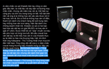 Bà Michelle Bachelet – Tổng thống Chilê khi đến Hà Nội dự hội nghị Apec 2006 mặc dù rất bận rộn, nhưng vẫn dành thời gian t́m đến Khaisilk để chọn mua cà vạt cho phu quân của ḿnh.