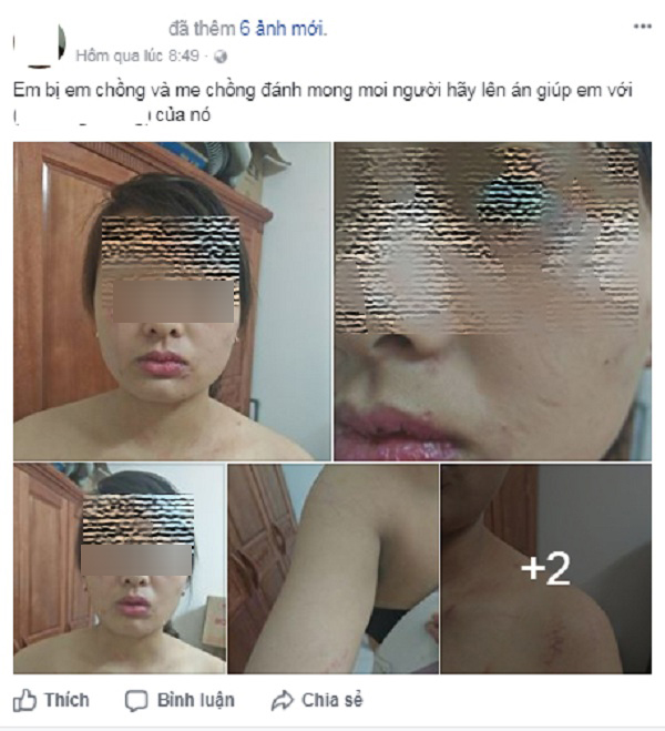 Một cô gái sinh năm 1995 đã chia sẻ lên trang cá nhân về việc bị gia đình nhà chồng bạo hành. Cô cho hay, do không nộp đủ tiền lương cho mẹ chồng, cô đã bị mẹ và em chồng "phạt". Cơ thể bị bầm tím do bị đánh cùng tinh thần hoảng loạn sau vụ việc, cô gái mong mình được bảo vệ khỏi sự tàn nhẫn này.