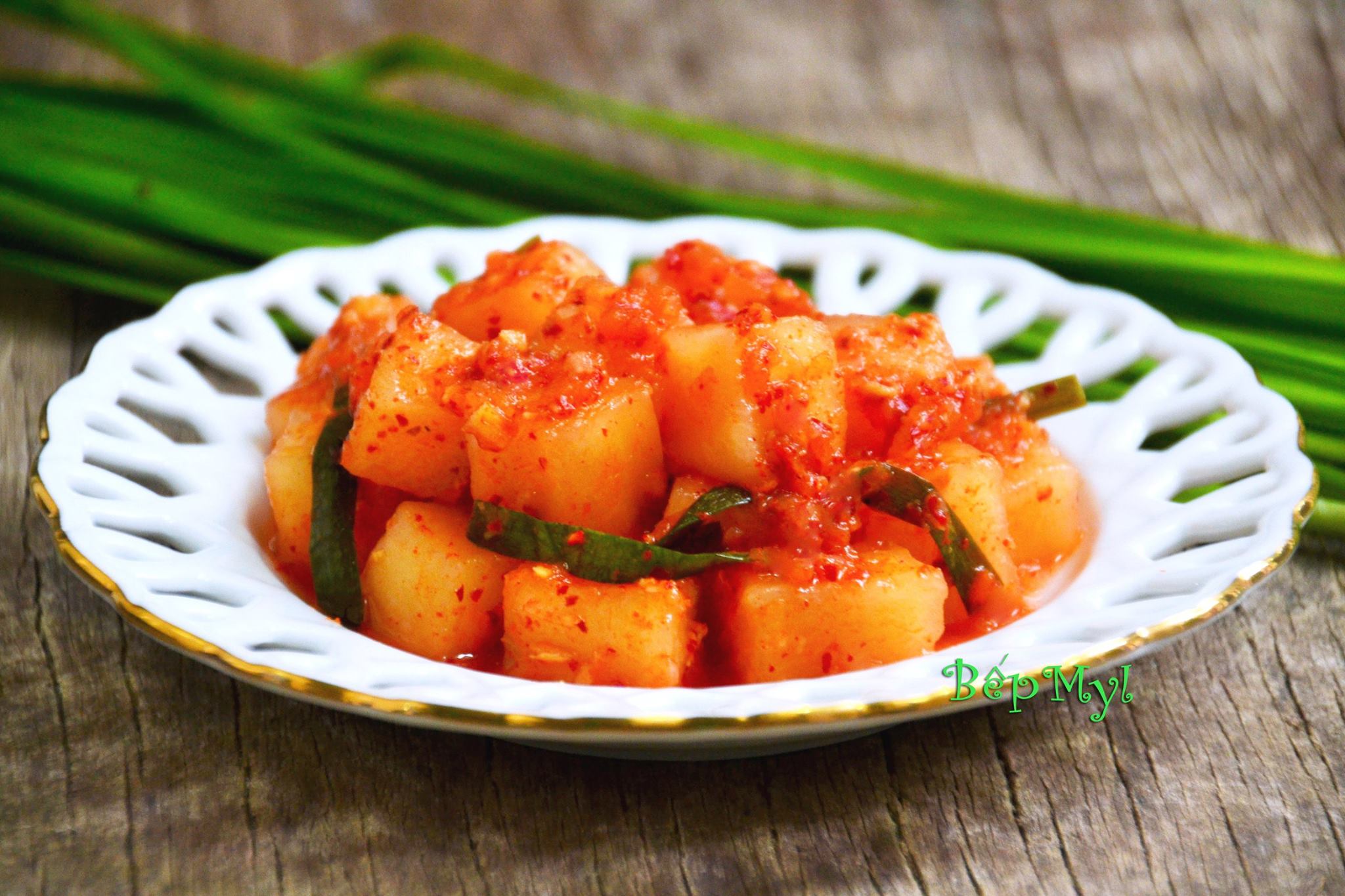 Làm sốt kim chi bằng cách hòa tan 50gr bột nếp với 1 bát nước lọc, bắt lên bếp khuấy đều cho sánh rồi để nguội. Hành tây, gừng, tỏi, táo, lê, cắt nhỏ cho vào máy xay nhuyển. Hẹ và hành lá cắt khúc 5cm. Trộn đều hỗn hợp vừa xay, thêm 3 thìa nước mắm và 3 thìa ớt bột. Cho tất cả mọi thứ vào hũ thủy tinh đậy kín, để nơi thoáng mát khoảng 1 ngày là có thể ăn được.