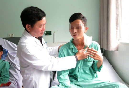 BS Dương Văn Một, Phó khoa Phẫu thuật Lồng ngực, cho hay: kết quả thăm khám, chẩn đoán hình ảnh xác định, đường đi của lưỡi kiếm đã xuyên thủng thực quản, rách khí quản đoạn cổ khiến hầu họng bệnh nhân phù nề. Ngay lập tức bệnh viện đã tiến hành phẫu thuật khâu lại các vị trí bị rách, đồng thời đặt ống thông dạ dày để nuôi ăn tạm thời.