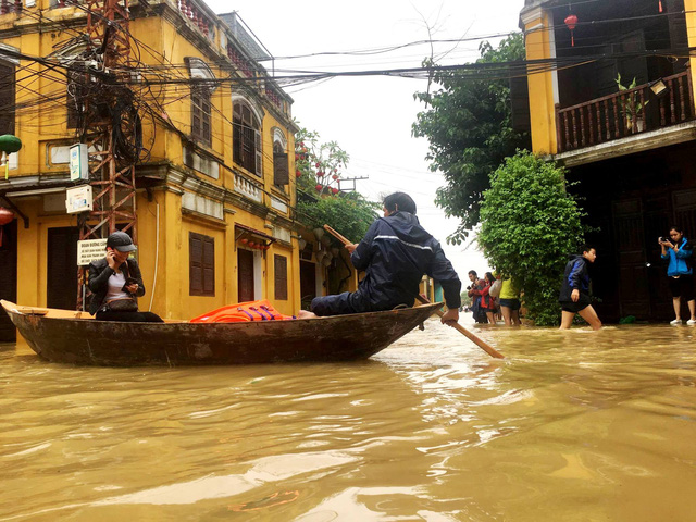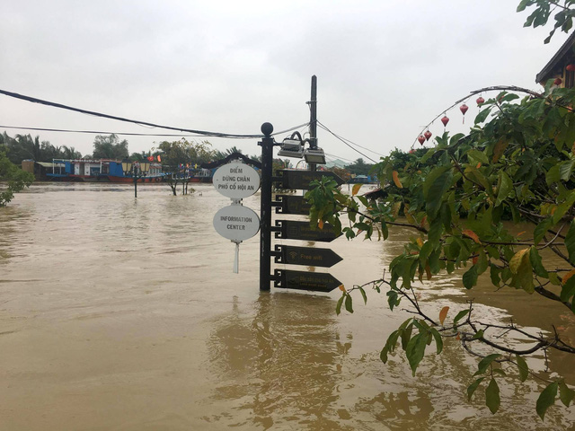Sáng qua 5/11, nước ở đường Bạch Đằng sát bờ sông Hoài đã trên 1m, nhiều nhà dân, nhà hàng, quán ăn đã đóng cửa. Đến khoảng 9h30 sáng nay 6/11, TP Hội An đã chìm trong biển nước. Nhiều tuyến đường phố như Bạch Đằng, Nguyễn Thái Học, Trần Phú… bị ngập sâu trên 1m. Riêng đoạn đường Bạch Đằng sát bờ sông Hoài nước ngập sâu hơn 2m.