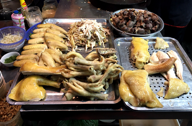 Xế chiều, giờ cơm tối chưa đến nhưng bụng đã hơi sôi, chi bằng ghé Hàng Hòm ăn phở gà Hà nhỉ. Đây là quán phở vỉa hè đúng chuẩn, lộ thiên hoàn toàn: Chiếc tủ kính khung nhôm chứa đầy gà luộc, cái bàn inox nằm chĩnh chện trước cô chủ quán, chồng bát sạch một bên, rổ bánh một bên, nồi nước dùng nóng giãy một bên. Tất cả chói chang dưới ánh đèn điện câu dây từ trong nhà ra.