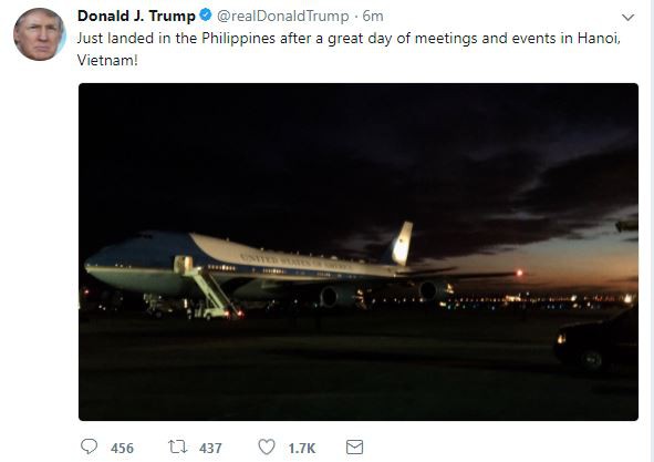Ít phút sau khi hạ cánh, tổng thống Trump đã cập nhật dòng trạng thái trên Twitter cá nhân. Ông viết, "Vừa hạ cánh xuống Philippines sau một ngày gặp gỡ và có các sự kiện tuyệt vời tại Hà Nội, Việt Nam!".