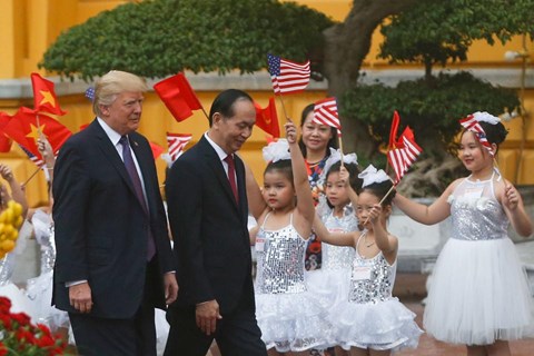 Tổng thống Mỹ Donald Trump và Chủ tịch nước Trần Đại Quang trong lễ đón tiếp chính thức hôm 12/11/2017.