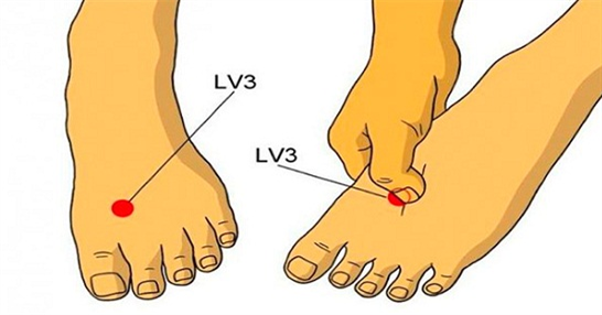 Huyệt thái xung nằm giữa điểm giao kết nối giữa xương ngón chân cái và ngón thứ hai (xem ảnh). Khi chạm tay vào đây, bạn có thể lắng nghe tiếng mạch của nhịp tim đập. Nếu khi bấm vào huyệt thái xung mà có cảm giác đau nhức, thì chứng tỏ gan của bạn đã có độc.