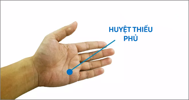 Huyệt thiếu phủ nằm ở trong lòng bàn tay (xem ảnh). Ngửa bàn tay ra, dùng ngón tay của tay này bấm huyệt cho tay kia, lực bấm có thể mạnh một chút cho đến khi đau nhẹ thì dừng lại.