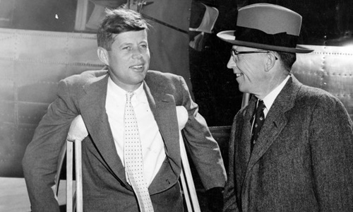 John F. Kennedy sử dụng nạng để đi lại trước cuộc phẫu thuật đốt sống vào tháng 10/1954
