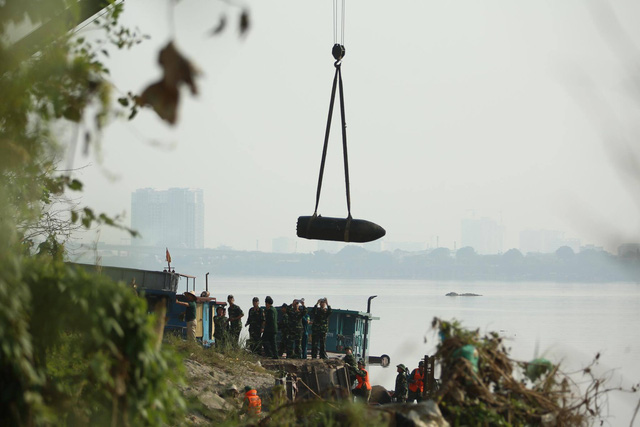 "Khi đưa quả bom lên bờ, lực lượng chức năng kiểm tra thì quả vẫn nguyên vẹn, vẫn còn kíp nổ. Khi đưa lên một bãi an toàn trên địa bàn tỉnh Bắc Giang, lực lượng chức năng đã cho thuốc nổ vào quả bom và xử lý cho nổ một cách an toàn. Quả bom này nặng khoảng 1,6 tấn" - lãnh đạo Ban Chỉ huy Quân sự quận Long Biên nói.