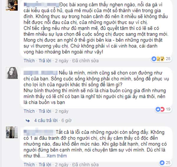 Cái kết của câu chuyện đọng lại trong tâm trí độc giả là sự nghẹn ngào trước số phận mong manh của cô gái trẻ. “Chỉ tiếc rằng nếu như đủ mạnh mẽ, đủ quyết tâm thì có lẽ sẽ có thêm nhiều sự lựa chọn để cuộc sống chị được sang một trang mới. Mong chị được an nghỉ ở thế giới bên kia - bên những người thật sự vì thương yêu chị. Chứ không phải vì cái vinh hoa, cái danh vọng hào nhoáng bên ngoài như vậy”, thành viên Nguyễn Lương cho hay.