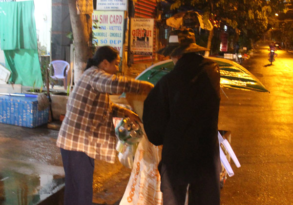 Ông Phước rẽ vào đường số 9, dừng lại trước một tiệm sửa quần áo. Người phụ nữ trong tiệm thấy ông, vội vàng mang ra một bịch vỏ lon nước ngọt và nhiều thùng giấy. Tất cả được xếp gọn, cho vào bao tải ông mang sau xe. "Ông uống nước không?", người phụ nữ hỏi và mang tiếp cho ông 2 lon nước ngọt.