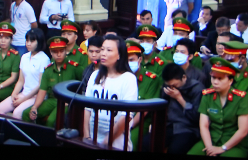 Tường Vy (tóc ngắn ngồi hàng ghế đầu) và đồng phạm tại toà.