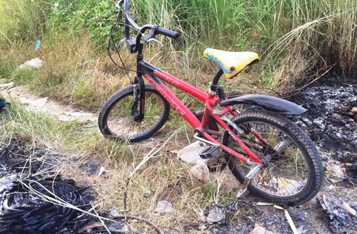 Cạnh thi thể nạn nhân cháy đen ở khu tái định cư có chiếc xe đạp mini khung xe màu đỏ, yên xe màu vàng, tay lái màu đen dựng chân chống giữa đường. Ngoài ra, nhà chức trách còn thu giữ một nắp nhựa hình tròn màu đỏ nghi có liên quan đến vụ án.