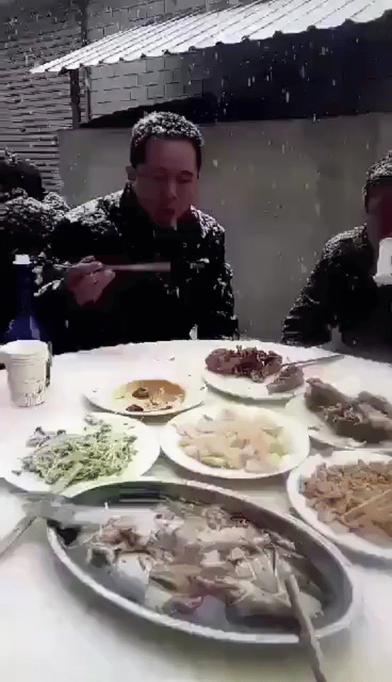 Ấy vậy mà, trong một đoạn clip được lan truyền trên các trang mạng xã hội Trung Quốc vài ngày vừa qua, một hàng người vẫn thản nhiên ngồi ăn uống vui vẻ mặc cho mưa tuyết đang rơi xuống đầu. Tính ra, bữa tiệc này có khoảng hơn chục mâm cỗ đầy đủ các món được bày trên bàn cho cả trăm người tham dự thưởng thức.