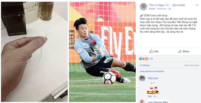 Hai ngày trở lại đây, chợ mạng rộ lên nhiều chiêu buôn bán lạ ăn theo kỳ tích của đội tuyển U23 Việt Nam, trong đó có cả việc một fan nữ rao bán 5 sợi tóc mà người này cho hay đã "may mắn túm được" từ đầu của Bùi Tiến Dũng, thủ môn đội tuyển U23 Việt Nam.
