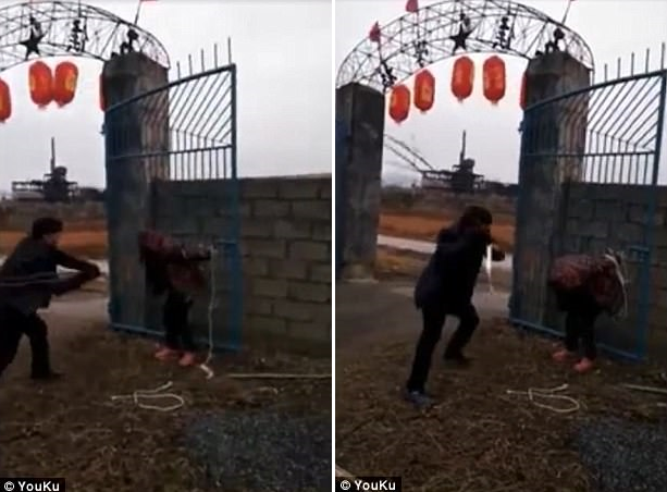 Dân làng đặt xác con chó vừa bị phóng phi tiêu độc lên vai người phụ nữ để sỉ nhục.