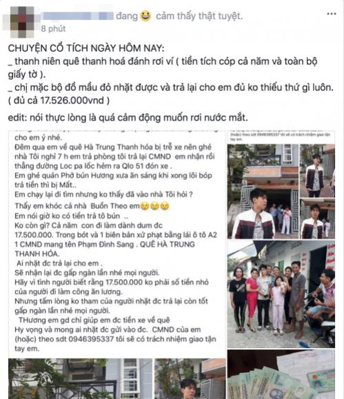Hãy vì tình người biết rằng 17.500.000 không phải số tiền nhỏ của người đi làm công ăn lương. Nhưng tấm lòng không tham của người nhặt được trả lại còn tốt gấp ngàn lần nhé mọi người. Thương em nhưng gia đình chỉ giúp em được tiền xe về quê".