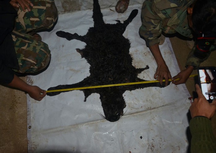 Cảnh sát Thái Lan đo bộ da con vật bị ông trùm xây dựng săn bắt trộm.