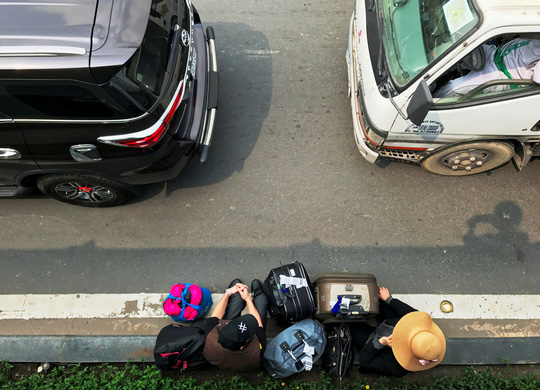 Giữa trưa nắng, hàng trăm người mệt mỏi. Trong hình, kẹt xe khiến 2 hành khách phải bỏ ô tô xách hành lý vào sân bay và tranh thủ ngồi nghỉ mệt bên đường