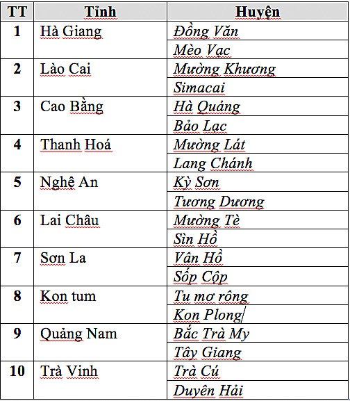 Danh sách 20 huyện nghèo thuộc 10 tỉnh dự kiến tiếp nhận kinh phí bán đấu giá áo và bóng của Đội tuyển U23 tặng Thủ tướng Nguyễn Xuân Phúc. (Nguồn: Bộ LĐ-TB&XH).
