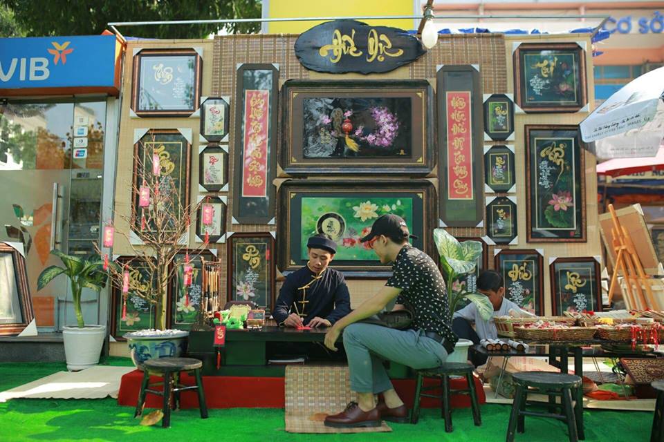 Không khí Tết cổ truyền thể hiện rõ trong từng gian hàng, nơi các ông đồ bày mực tàu, giấy đỏ trên phố ngồi viết câu đối. Ảnh: Thúy Hà