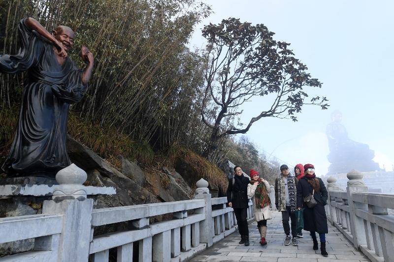 Từ đại tượng Phật, con đường La Hán giống như đường dẫn vào cơi Phật linh thiêng. Bên này đường, những gốc đỗ quyên hàng trăm tuổi x̣a xuống những nụ mầm căng đầy sức sống trong giá rét. 18 bức tượng La Hán bằng đồng cao 2,5m mang đến nhân gian đủ sắc thái cảm xúc nhân từ, độ lượng. Bên kia lối đi lát đá ấy là khói sương bảng lảng mây bay.