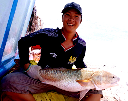 Anh Huỳnh Văn Trải (34 tuổi, ở huyện Ngọc Hiển) cho biết, mới đây, khi đánh bắt cách đảo Hòn Khoai 3 hải lý, anh phát hiện con cá lạ nặng 6 kg, dài khoảng 65 cm, thân lấp lánh màu vàng, vi hồng đỏ trong mẻ lưới.