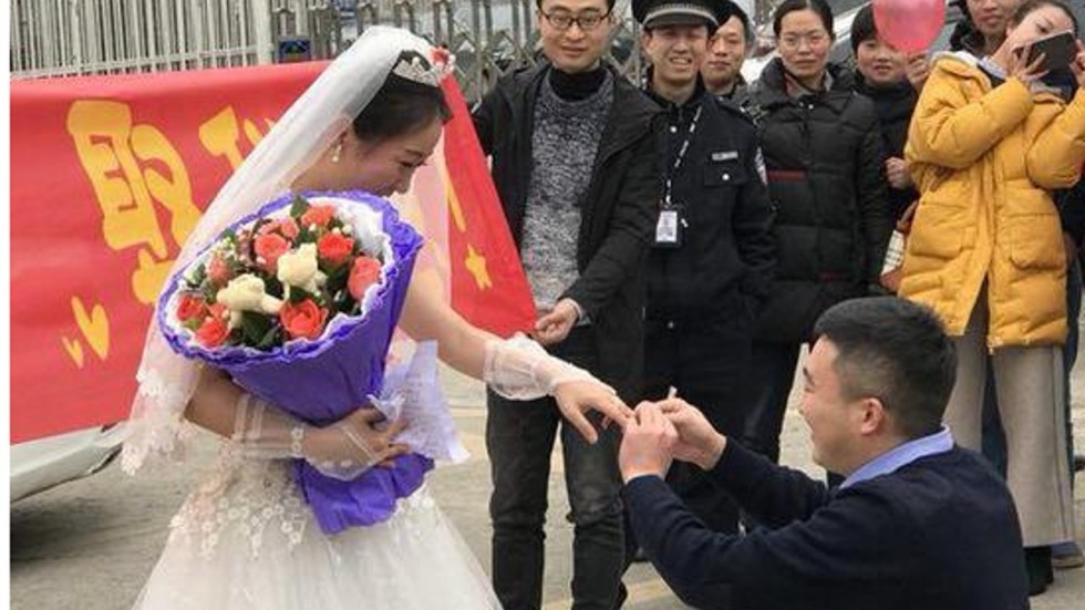 Thật ngưỡng mộ tình yêu của một cô giáo dành cho người yêu của mình. Cô gái mặc áo cưới đứng đợi bạn trai trước cổng nhà tù để cầu hôn. Chàng trai vừa bước ra khỏi cổng nhà tù, không khỏi bất ngờ và xúc động khi chứng kiến người yêu lộng lẫy trong bộ váy cưới, xung quanh là những người bạn đang giơ cao chiếc băng rôn to đùng với dòng chữ “Zhao Wanping, làm chồng em nhé!”