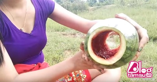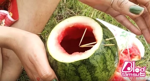 Một cô gái khá sáng tạo khi sử dụng một trái dưa hấu. Đầu tiên cô gái lấy hết ruột quả dưa ra ngoài, sau đó cắm tăm nhọn quanh trái dưa và thả xuống mương nước. Thành quả sau đó khiến thật bất ngờ.