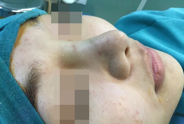2 tháng sau, chị S. cảm thấy mũi mình càng ngày càng sưng to, xuất hiện các đốm màu tím, mũi co rút ngắn và biến dạng… Quá hoảng sợ và lo lắng, chị S. đã tới một bệnh viện thẩm mỹ tại TP.HCM để cầu cứu.
