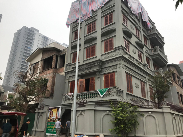 Trong khi những căn biệt thự cùng trong khu đô thị này chỉ xây dựng kết cấu 3 tầng 1 tum thì căn biệt thự của vợ chồng ông Nguyễn Thanh Hoá nổi bật lên ở lô góc (ký hiệu BT1), cao tới 5 tầng và có kiến trúc khác biệt hoàn toàn.