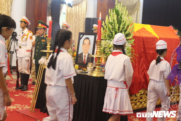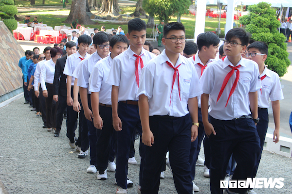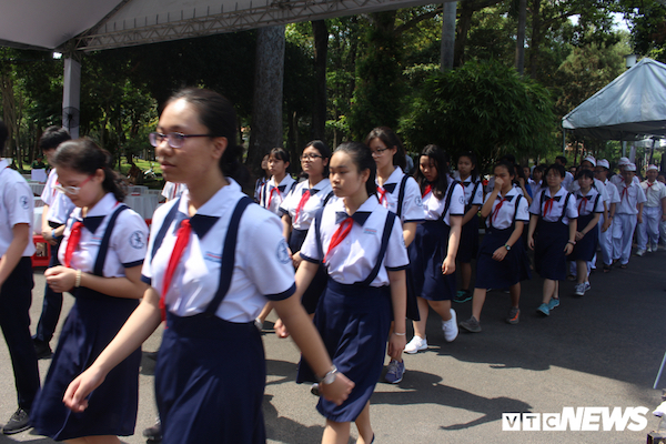 Đoàn học sinh kính cẩn cúi đầu trước lĩnh cữu nguyên Thủ tướng.