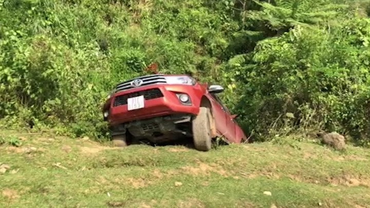 Khi đến bìa rừng thuộc xã Sơn Ba thì xe bị lật, lực lượng chức năng ập đến bắt được 1 nghi phạm, 2 nghi phạm còn lại lẩn trốn. Tang vật mà các nghi phạm bỏ lại trên xe có súng và cả lựu đạn. Trong ảnh: Chiếc xe bán tải các đối tượng điều khiển bỏ lại hiện trường (ảnh: Tuổi trẻ)