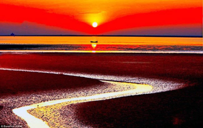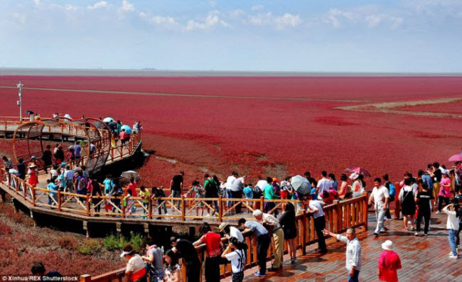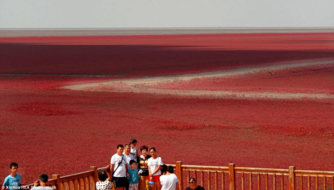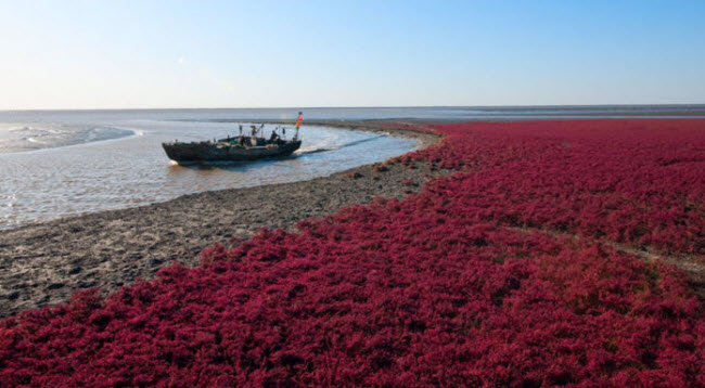 Đó là bãi biển Đỏ ở tỉnh Liêu Ninh, Trung Quốc. Đến đây bạn sẽ thấy ngỡ ngàng bởi bãi biển có màu đỏ rực nhu máu. Du khách thậm chí không dám nhúng chân.