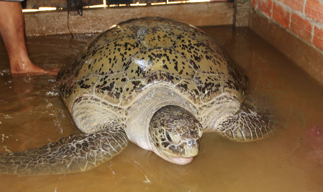 Con rùa biển đang được gia đình ông Ren tạm nuôi có chiều dài mai 1,2 m, chiều rộng 94 cm, nặng khoảng 200 kg.