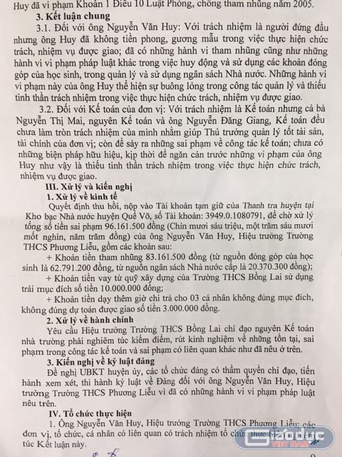 “Về mặt kinh tế, quyết định thu hồi, nộp vào tải khoản tạm giữ của Thanh tra huyện tại Kho bạc Nhà nước huyện Quế Võ số tiền 96.161.500 đồng của ông Nguyễn Văn Huy, Hiệu trưởng Trường Trường trung học cơ sở Phương Liễu, gồm các khoản sau: