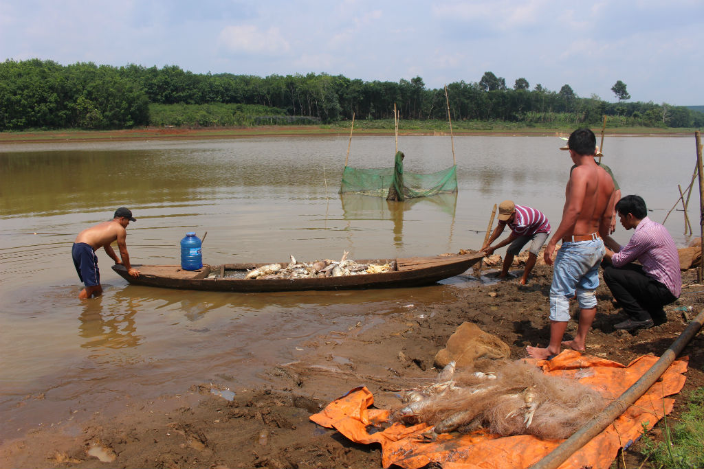 Không chỉ cá nuôi trong đập, bên ngoài các kênh rạch, ao suối gần kề cũng có tình trạng cá chết nổi trắng mặt nước; có con trọng lượng lên tới 7kg. Trước tai họa giáng xuống bất ngờ, các hộ dân nuôi cá trong vùng phải tức tốc vớt cá lên bờ.