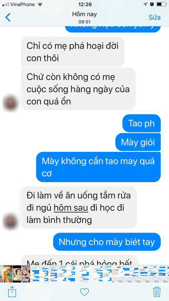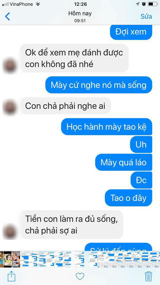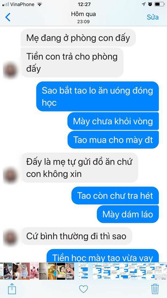 “Giờ con gái lớn học đại học, nó quay sang chửi mẹ đẻ. Tôi có ngăn cấm nó yêu một thằng không nghề nghiệp ở Hà Nội đang ăn bám nó. Tôi gửi thức ăn từ quê lên đều đặn cho nó và 1 bạn gái ở cùng nữa. Nó “hãm tài” thì làm sao tôi nuôi được khi vay lương còn chưa trả hết. Khuyên răn không được, nó quay sang chửi cả mẹ đẻ.