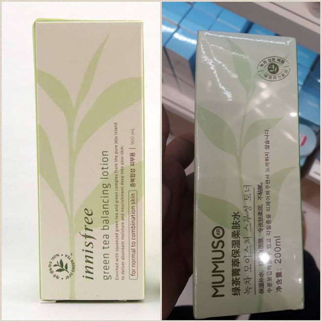 Các khách hàng ưa chuông mĩ phẩm Hàn Quốc có thể nhận ra những thiết kế quen thuộc của một số thương hiệu mỹ phẩm của Hàn Quốc tại các sản phẩm nằm trên quầy kệ của Mumuso. Ví như nước hoa hồng – matcha 018017 của Mumuso và nước hoa hồng Innisfree Green Tea Balancing Skin của thương hiệu mỹ phẩm Hàn Quốc Innisfree đều sử dụng thiết kế bao bì màu xanh nhạt kèm theo hình lá trà xanh.