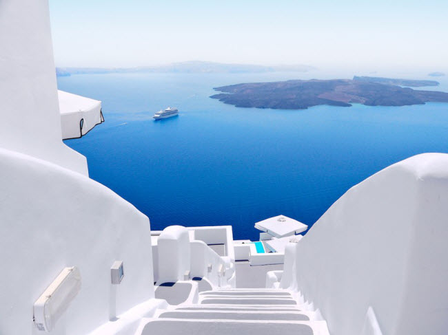 Tàu du lịch di chuyển gần hòn đảo Santorini, Hi Lạp.