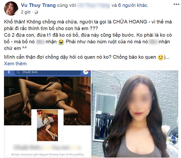Chị cho biết, sau đó chị được một người bạn cùng lớp kể thêm về người phụ nữ này. Theo đó, cô gái tên Tr. A đã có một con và hiện đang mang thai đứa thứ hai nhưng không có chồng. Chị cho biết, cô gái này hiện đang làm việc tại 1 quán bar.