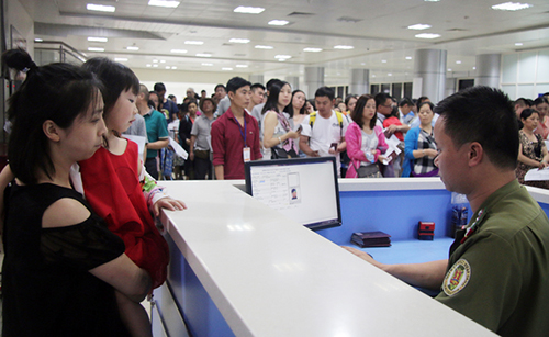Cán bộ công an cửa khẩu kiểm tra hộ chiếu khách Trung Quốc tại sân bay Cam Ranh khi làm thủ tục xuất nhập cảnh. Ảnh: Xuân Ngọc.