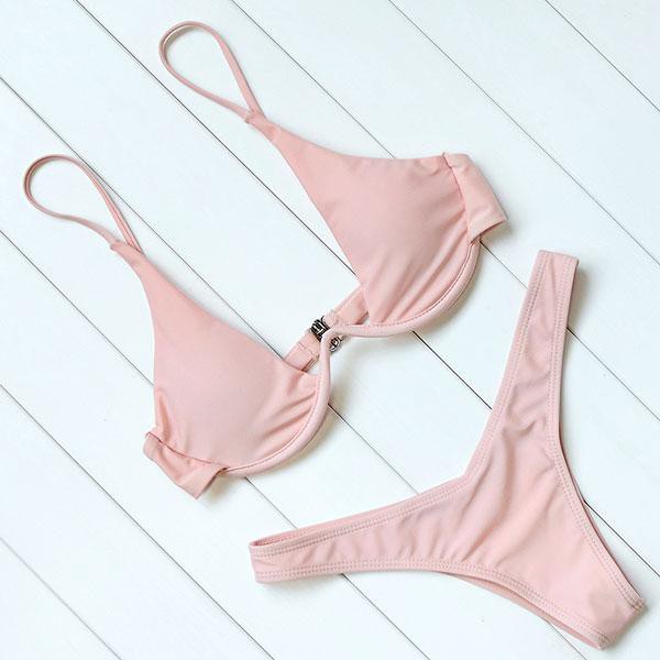Bikini chữ V cũng chính là những mẫu bikini 2 mảnh thông thường, thế nhưng phần gọng lại được nhà sản xuất khéo léo uốn thành hình chữ V. Chính vì lẽ đó khi mặc lên phần gọng chữ V này sẽ ôm sát vào chân ngực, tạo độ sâu ảo khiến ngực trông căng tròn, đầy đặn hơn. Chưa kể thiết kế này còn khiến ngực có độ đầy đặn tự nhiên chứ không bị push up quá đà hay gây cảm giác nặng nề khó chịu như những loại bikini lót đệm thông thường.