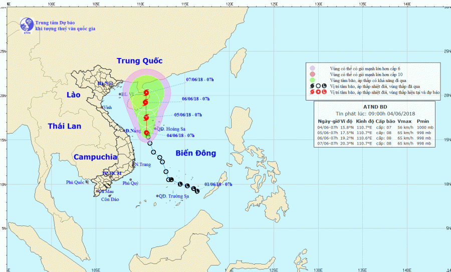 Hồi 07 giờ ngày 04/6, vị trí tâm áp thấp nhiệt đới ở vào khoảng 15,8 độ Vĩ Bắc; 110,7 độ Kinh Đông, trên khu vực vùng biển quần đảo Hoàng Sa. Sức gió mạnh nhất vùng gần tâm áp thấp nhiệt đới mạnh cấp 6-7 (40-60km/giờ), giật cấp 8.