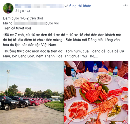 Tối 6/6, mạng xã hội chia sẻ nhiều hình ảnh đám cưới "khủng" của một đại gia bất động sản có tiếng ở Hà Nội. Đoàn xe đón dâu gồm 150 xe, cứ 10 xe đen xen kẽ một chiếc xe đỏ. Ngoài ra còn có thêm 10 chiếc xe 45 chỗ để đón khách đến nơi tổ chức lễ cưới. Tiệc đãi khách toàn các món ăn đặc sản đắt tiền đến từ nhiều vùng miền khác nhau như: tôm hùm, cua huỳnh đế, cua bể Cà Mau, lợn quay Lạng Sơn, nem Thanh Hóa, thịt chua Phú Thọ… Hôn lễ được tổ chức tại sân khấu nổi Đồng Mô - Làng văn hóa du lịch các dân tộc Việt Nam.
