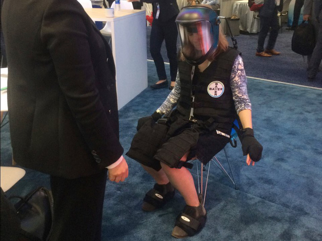 Trong một gian hàng của Bayer, hãng hóa dược phẩm khổng lồ của Đức, có một bộ đồ kì quặc thu hút được sự chú ý của rất nhiều người. Không phải một bản demo thực tế ảo hay cái gì đó tương tự - bộ đồ này mô phỏng cho người mặc cái cảm giác thực tế khi họ 80 tuổi.