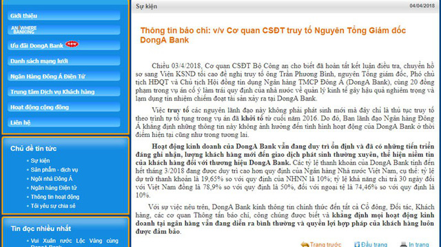 Cơ quan CSĐT Bộ Công an vừa hoàn tất kết luận điều tra, chuyển hồ sơ sang Viện KSND Tối cao đề nghị truy tố ông Trần Phương Bình (nguyên TGĐ, Phó chủ tịch HĐQT và Chủ tịch Hội đồng tín dụng Ngân hàng TMCP Đông Á ) về tội Lạm dụng chức vụ, quyền hạn chiếm đoạt tài sản. Ông Bình còn bị truy cứu trách nhiệm hình sự về tội Cố ý làm trái quy định của Nhà nước về quản lý kinh tế gây hậu quả nghiêm trọng.