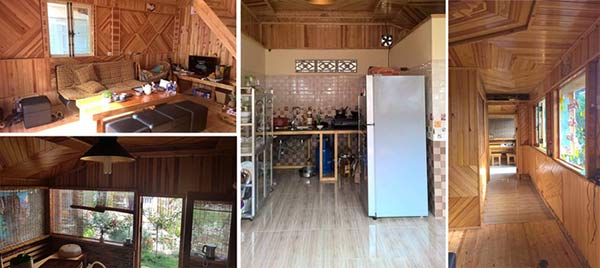 Nội thất có thiết kế giản dị với gỗ thông được xử lý để chống thấm nước. Riêng khu bếp được ốp lát gạch, giúp việc giữ gìn vệ sinh dễ dàng.